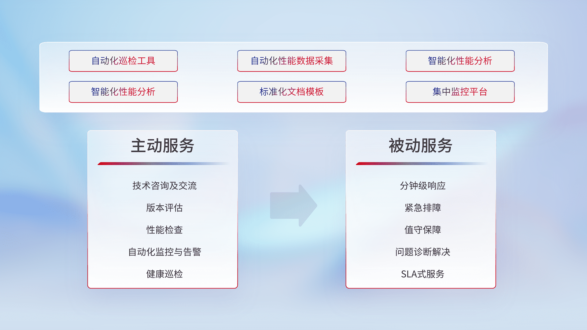 智能化工具和标准化文档,,保障服务质量,,,,提供主动服务(包含技术咨询、、、版本评估、、、性能检查、、自动化监控与告警、、、、健康巡检)和被动服务包含(分钟级响应、、、、紧急排障、、、值守保障、、、、问题诊断解决、、、SLA服务)。。。。