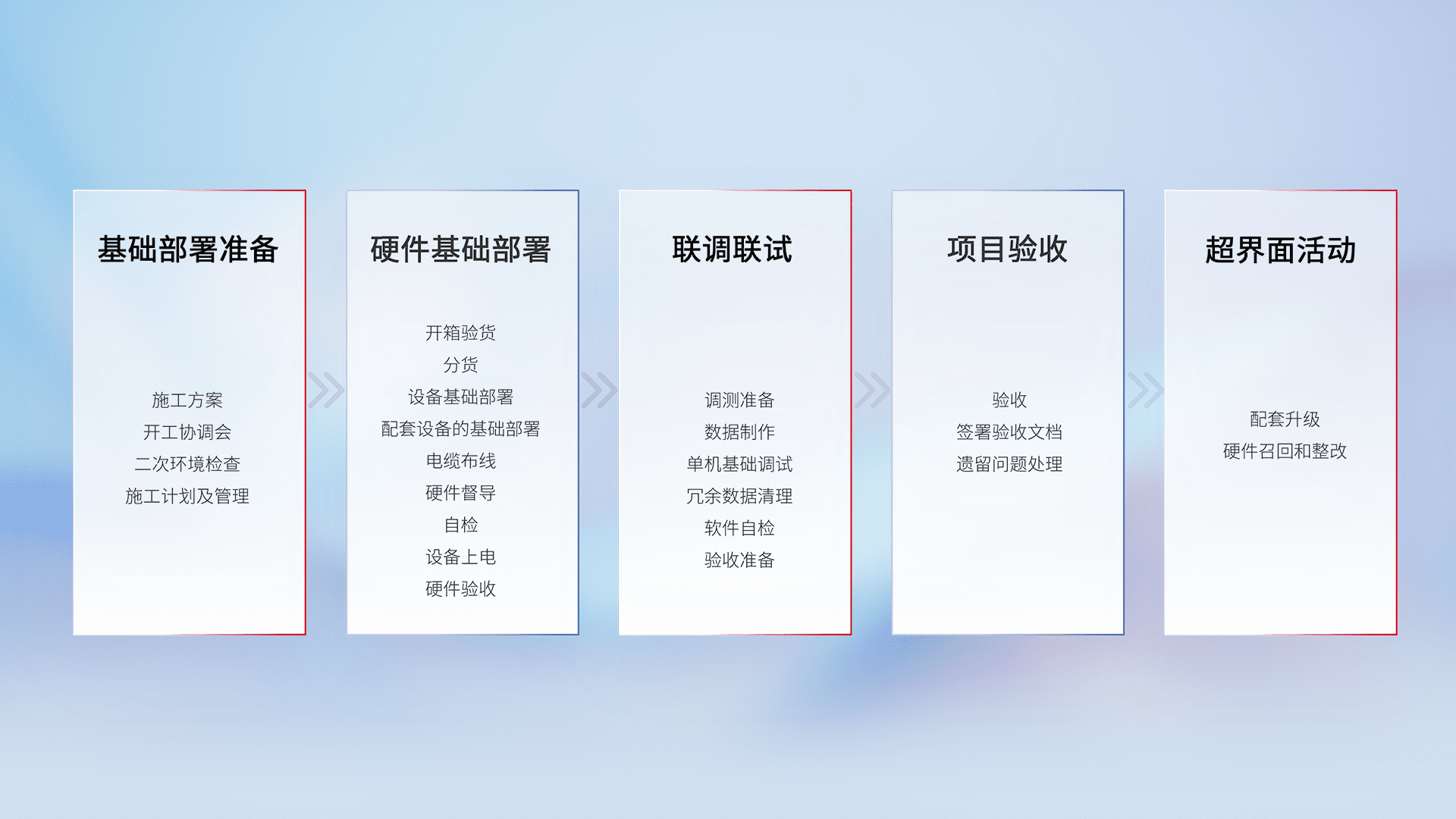 从基础部署准备、、硬件基础部署、、、联调联试、、、、项目验收、、、、越界面活动的全过程可追溯,,,,保证施工质量和进度。。。。